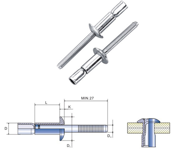 拉絲鉚釘是一種結(jié)構(gòu)獨(dú)特、鉚接強(qiáng)度較高的金屬連接件,屬于新型緊固零件。拉絲型抽芯鉚釘?shù)你T釘釘芯被拉進(jìn)鉚體后,在專(zhuān)用鉚釘槍作用下,釘芯斷釘處會(huì)翻邊入鉚體凹槽內(nèi),形成“機(jī)械外鎖”,鎖緊釘心。